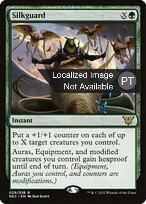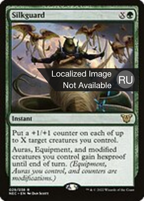 ![]() Variations : 1Parts— | SilkguardPut a +1/+1 counter on each of up to X target creatures you control. Auras, Equipment, and modified creatures you control gain hexproof until end of turn. (Equipment, Auras you control, and counters are modifications.)