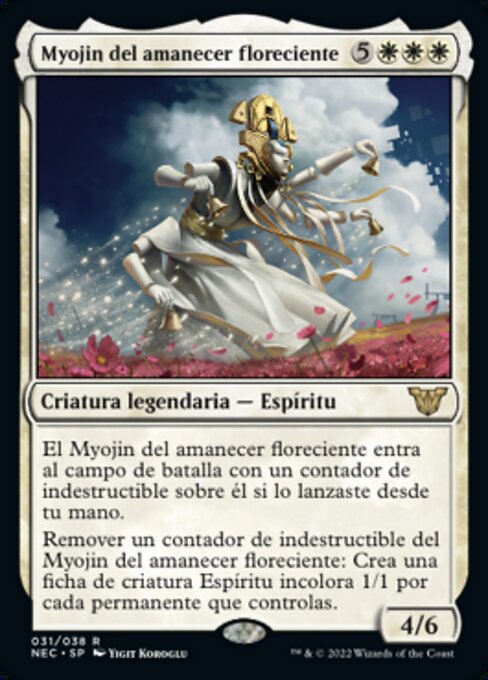 ![]() Variations : 1Parts : 2 | Myojin of Blooming Dawn4 / 6 Myojin of Blooming Dawn enters with an indestructible counter on it if you cast it from your hand. Remove an indestructible counter from Myojin of Blooming Dawn: Create a 1/1 colorless Spirit creature token for each permanent you control.