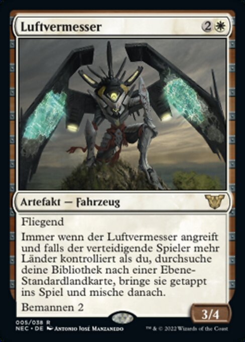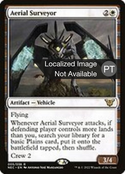 |  Variations : 1Parts— | Aerial Surveyor3 / 4 Flying Whenever this Vehicle attacks, if defending player controls more lands than you, search your library for a basic Plains card, put it onto the battlefield tapped, then shuffle. Crew 2