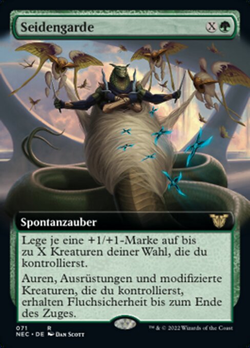 |  Variations : 1Parts— | SilkguardPut a +1/+1 counter on each of up to X target creatures you control. Auras, Equipment, and modified creatures you control gain hexproof until end of turn. (Equipment, Auras you control, and counters are modifications.)