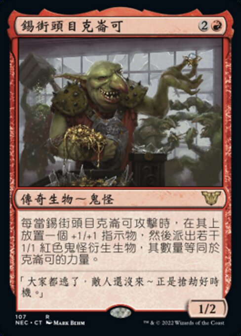 |  Variations— Parts— | Krenko, Boss di Via Latta1 / 2 Ogniqualvolta Krenko, Boss di Via Latta attacca, metti un segnalino +1/+1 su di esso, poi crea un numero di pedine creatura Goblin 1/1 rosse pari alla forza di Krenko.