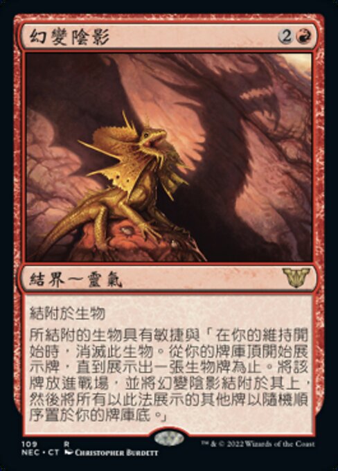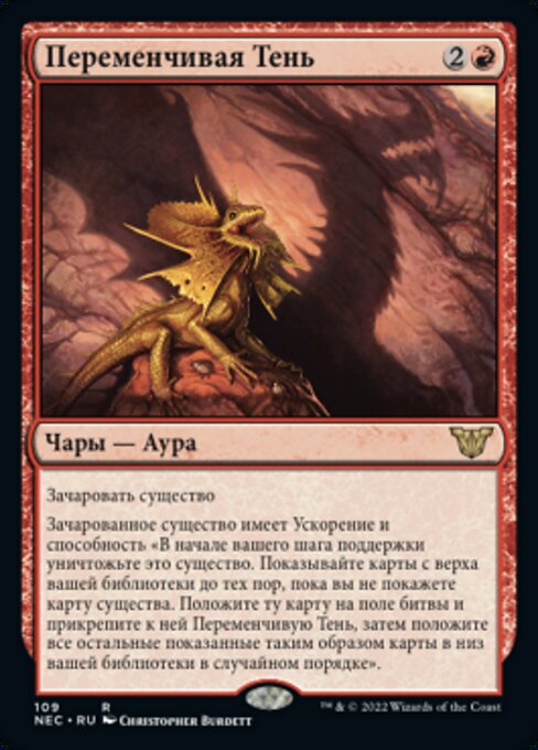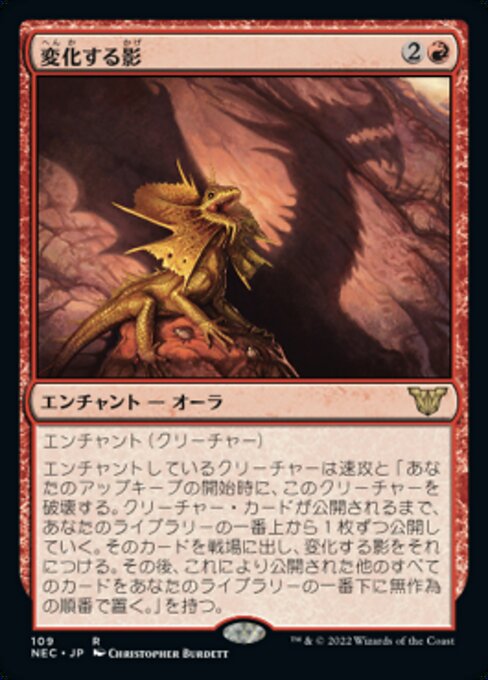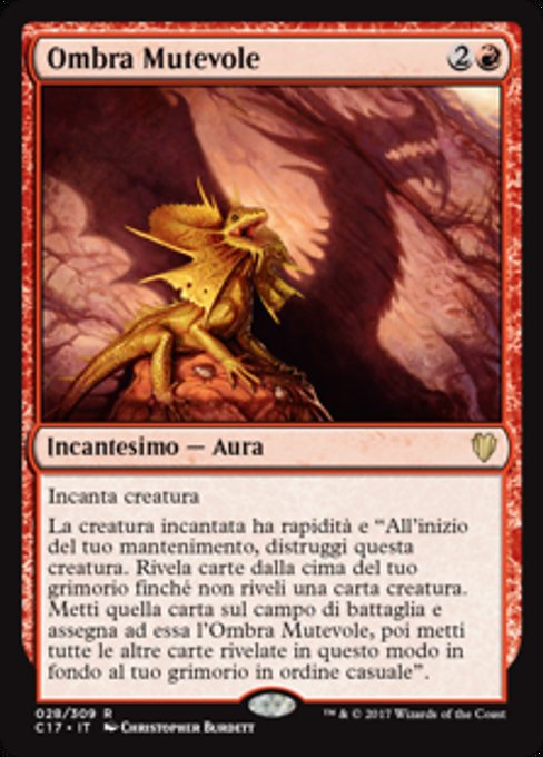 ![]() Variations— Parts— | Ombra MutevoleIncanta creatura La creatura incantata ha rapidità e "All'inizio del tuo mantenimento, distruggi questa creatura. Rivela carte dalla cima del tuo grimorio finché non riveli una carta creatura. Metti quella carta sul campo di battaglia e assegna ad essa l'Ombra Mutevole, poi metti tutte le altre carte rivelate in questo modo in fondo al tuo grimorio in ordine casuale".