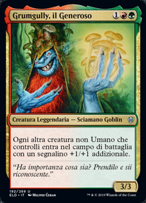 ![]() Variations— Parts— | Grumgully, il Generoso3 / 3 Ogni altra creatura non Umano che controlli entra nel campo di battaglia con un segnalino +1/+1 addizionale.