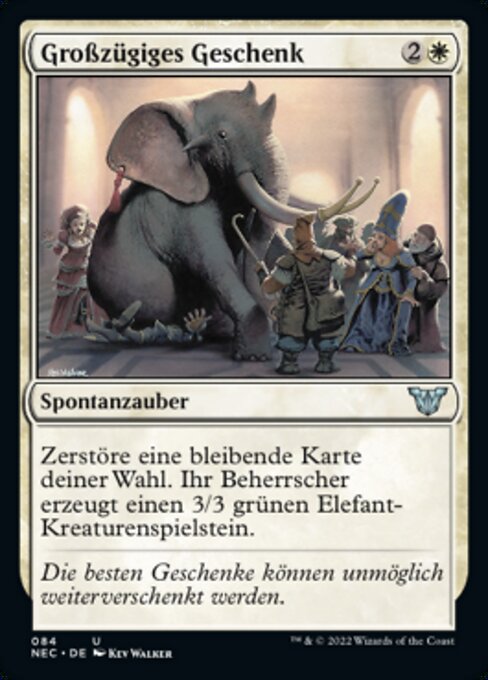 ![]() Variations— Parts— | Dono AbbondanteDistruggi un permanente bersaglio. Il suo controllore crea una pedina creatura Elefante 3/3 verde.