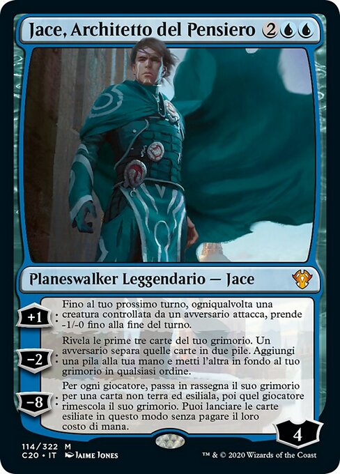|  Variations— Parts— | Jace, Architetto del Pensiero+1 : Fino al tuo prossimo turno, ogniqualvolta una creatura controllata da un avversario attacca, prende -1/-0 fino alla fine del turno. −2 : Rivela le prime tre carte del tuo grimorio. Un avversario separa quelle carte in due pile. Aggiungi una pila alla tua mano e metti l'altra in fondo al tuo grimorio in qualsiasi ordine. −8 : Per ogni giocatore, passa in rassegna il suo grimorio per una carta non terra ed esiliala, poi quel giocatore rimescola. Puoi lanciare le carte esiliate in questo modo senza pagare il loro costo di mana.