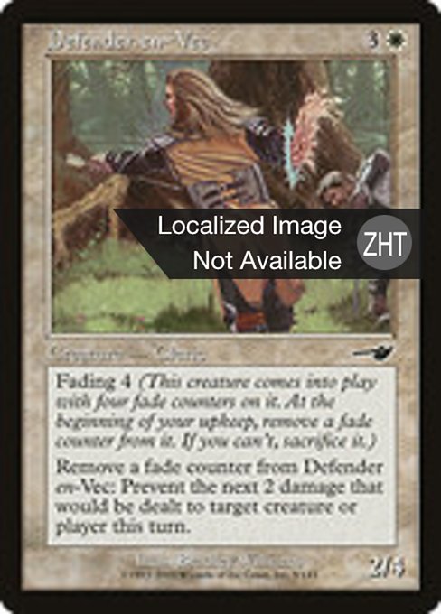 |  Variations— Parts— | Defender en-Vec2 / 4 Fading 4 (This creature enters with four fade counters on it. At the beginning of your upkeep, remove a fade counter from it. If you can't, sacrifice it.) Remove a fade counter from this creature: Prevent the next 2 damage that would be dealt to any target this turn.