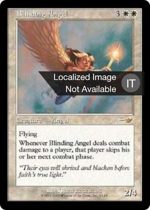 ![]() Variations— Parts— | Angelo Accecante2 / 4 Flying (This creature can't be blocked except by creatures with flying or reach.) Whenever this creature deals combat damage to a player, that player skips their next combat phase.