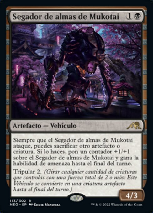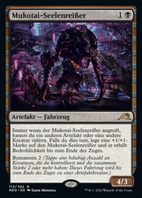 ![]() Variations : 2Parts— | Mukotai Soulripper4 / 3 Whenever this Vehicle attacks, you may sacrifice another artifact or creature. If you do, put a +1/+1 counter on this Vehicle and it gains menace until end of turn.Crew 2 (Tap any number of creatures you control with total power 2 or more : This Vehicle becomes an artifact creature until end of turn.)