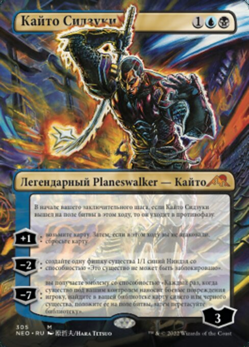 |  Variations : 3Parts : 3 | Kaito ShizukiAt the beginning of your end step, if Kaito entered this turn, he phases out. +1 : Draw a card. Then discard a card unless you attacked this turn. −2 : Create a 1/1 blue Ninja creature token with "This token can't be blocked." −7 : You get an emblem with "Whenever a creature you control deals combat damage to a player, search your library for a blue or black creature card, put it onto the battlefield, then shuffle."