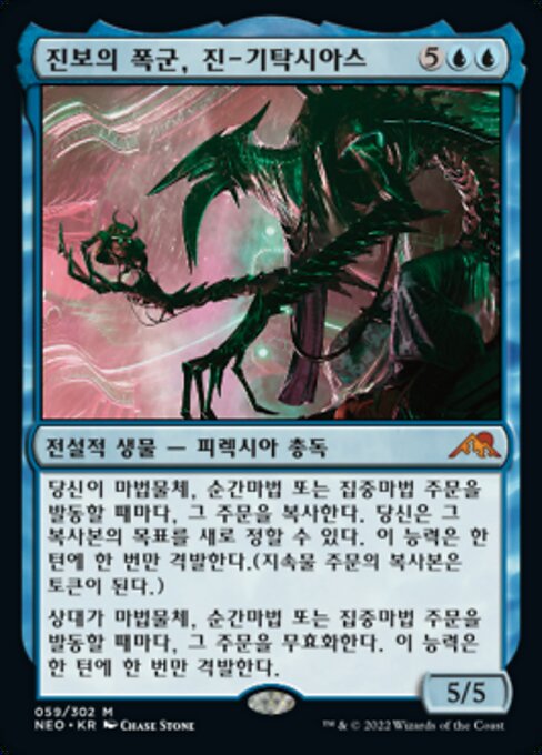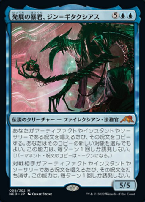 |  Variations : 4Parts : 3 | Jin-Gitaxias, Progress Tyrant5 / 5 Whenever you cast an artifact, instant, or sorcery spell, copy that spell. You may choose new targets for the copy. This ability triggers only once each turn. (A copy of a permanent spell becomes a token.) Whenever an opponent casts an artifact, instant, or sorcery spell, counter that spell. This ability triggers only once each turn.