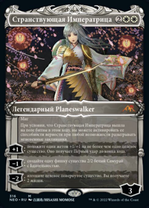 |  Variations : 2Parts— | 放浪皇瞬速 放浪皇がこのターンに戦場に出たのであるかぎり、これの忠誠度能力を、あなたがインスタントを唱えられるときならいつでも起動してもよい。 +1:クリーチャー最大1体を対象とする。それの上に+1/+1カウンター1個を置く。ターン終了時まで、それは先制攻撃を得る。 −1:警戒を持つ白の2/2の侍・クリーチャー・トークン1体を生成する。 −2:タップ状態のクリーチャー1体を対象とする。それを追放する。あなたは2点のライフを得る。