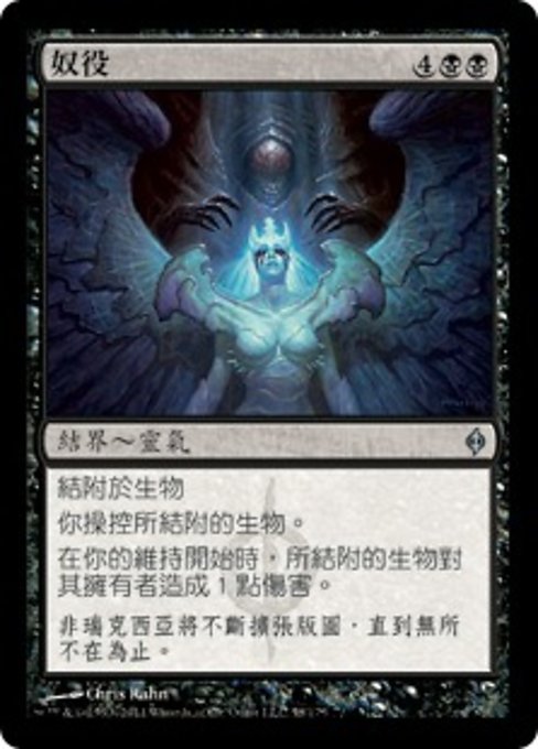 |  Variations— Parts— | EnslaveEnchant creature You control enchanted creature. At the beginning of your upkeep, enchanted creature deals 1 damage to its owner.