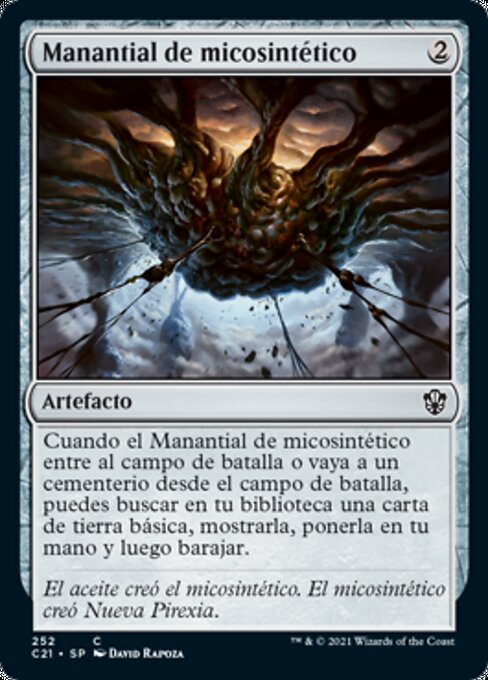 |  Variations— Parts— | Manantial de micosintéticoCuando el Manantial de micosintético entre al campo de batalla o vaya a un cementerio desde el campo de batalla, puedes buscar en tu biblioteca una carta de tierra básica, mostrarla, ponerla en tu mano y luego barajar tu biblioteca.