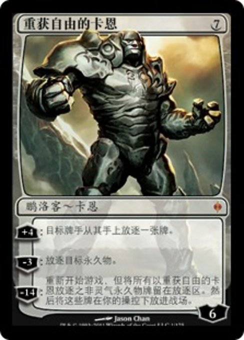 |  Variations— Parts— | 解放された者、カーン+4 +4+4 プレイヤー1人を対象とする。そのプレイヤーは自分の手札にあるカードを1枚追放する。-3 +4: プレイヤー1人を対象とする。そのプレイヤーは自分の手札にあるカードを1枚追放する。 -3+4 プレイヤー1人を対象とする。そのプレイヤーは自分の手札にあるカードを1枚追放する。-3 パーマネント1つを対象とし、それを追放する。-14 : 解放された者、カーンにより追放されたすべてのオーラでないパーマネント・カードを別にして、ゲームを再び開始する。 その後、それらの別にしたカードをあなたのコントロール下で戦場に出す。