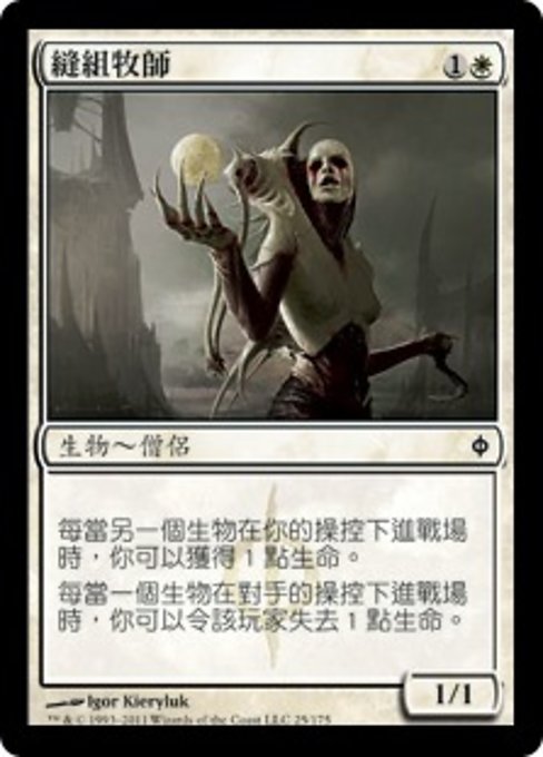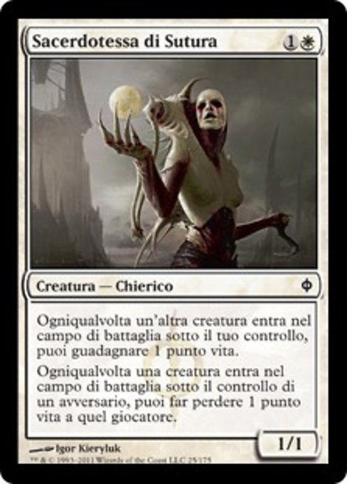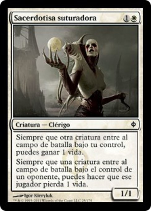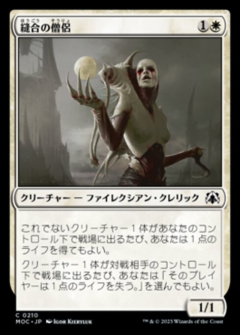 ![]() Variations— Parts— | 縫合の僧侶1 / 1 他のクリーチャーが1体あなたのコントロール下で戦場に出るたび、あなたは1点のライフを得てもよい。 クリーチャーが1体いずれかの対戦相手のコントロール下で戦場に出るたび、あなたは「そのプレイヤーは1点のライフを失う。」を選んでもよい。