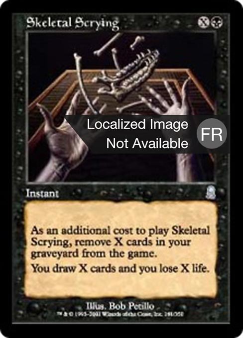 |  Variations— Parts— | Skeletal ScryingAs an additional cost to cast this spell, exile X cards from your graveyard. You draw X cards and you lose X life.