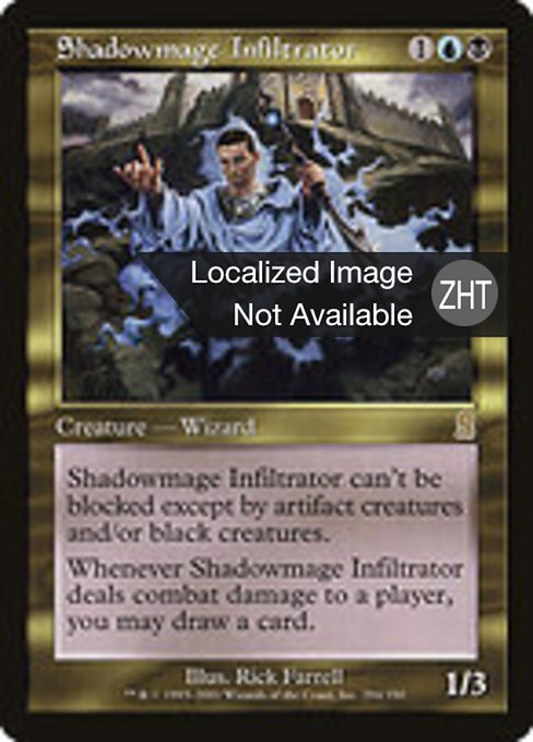 ![]() Variations— Parts— | Shadowmage Infiltrator1 / 3 Fear (This creature can't be blocked except by artifact creatures and/or black creatures.) Whenever this creature deals combat damage to a player, you may draw a card.