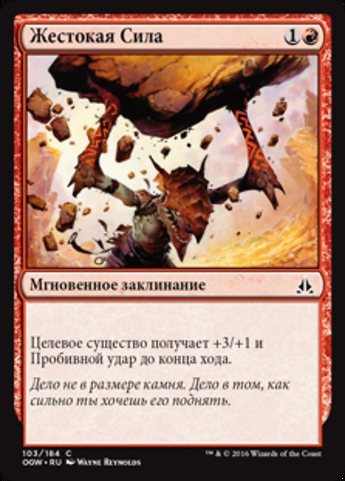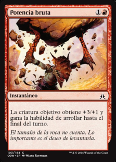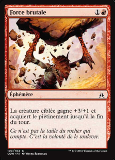 |  Variations— Parts— | Brute StrengthTarget creature gets +3/+1 and gains trample until end of turn. (It can deal excess combat damage to the player or planeswalker it's attacking.)