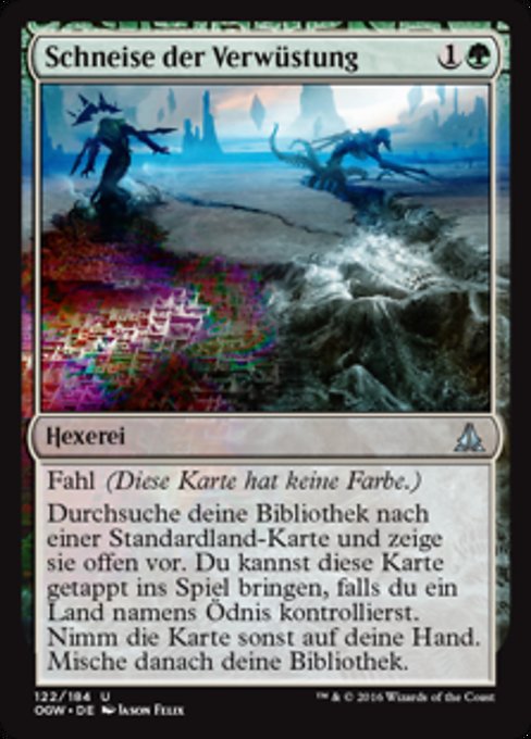 |  Variations— Parts— | Ruin in Their WakeDevoid (This card has no color.) Search your library for a basic land card and reveal it. You may put that card onto the battlefield tapped if you control a land named Wastes. Otherwise, put that card into your hand. Then shuffle.