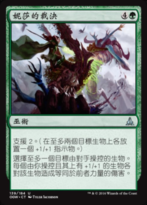 |  Variations— Parts— | Nissa's JudgmentSupport 2. (Put a +1/+1 counter on each of up to two target creatures.) Choose up to one target creature an opponent controls. Each creature you control with a +1/+1 counter on it deals damage equal to its power to that creature.