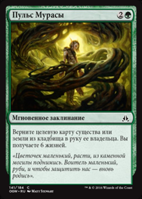 ![]() Variations— Parts— | Pulse of MurasaReturn target creature or land card from a graveyard to its owner's hand. You gain 6 life.