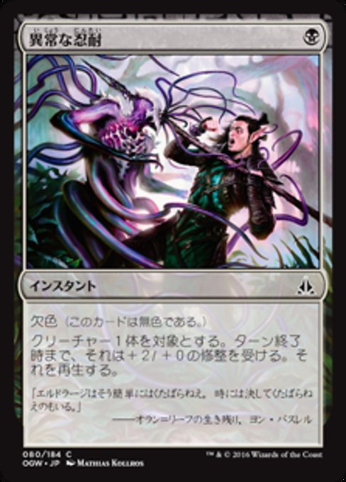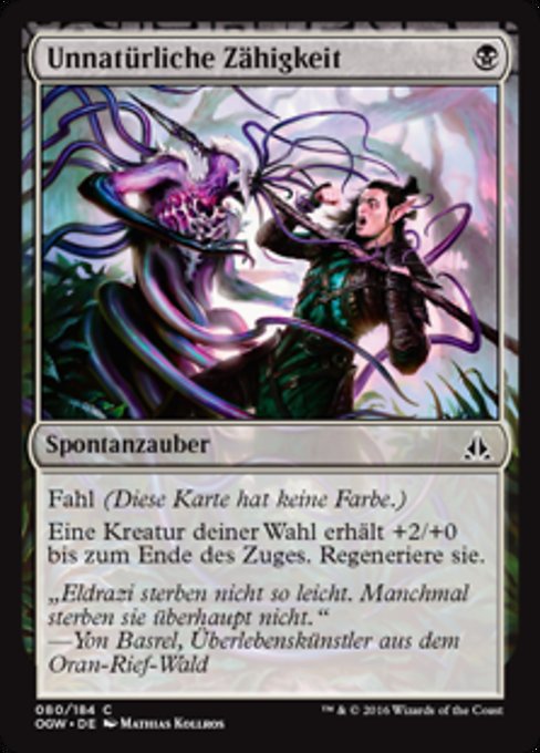 ![]() Variations— Parts— | Unnatural EnduranceDevoid (This card has no color.) Target creature gets +2/+0 until end of turn. Regenerate it.