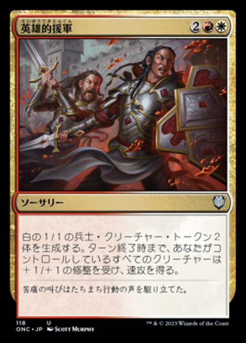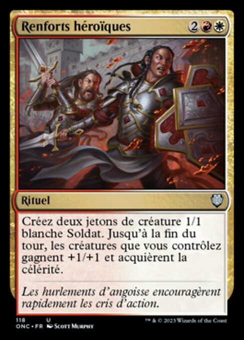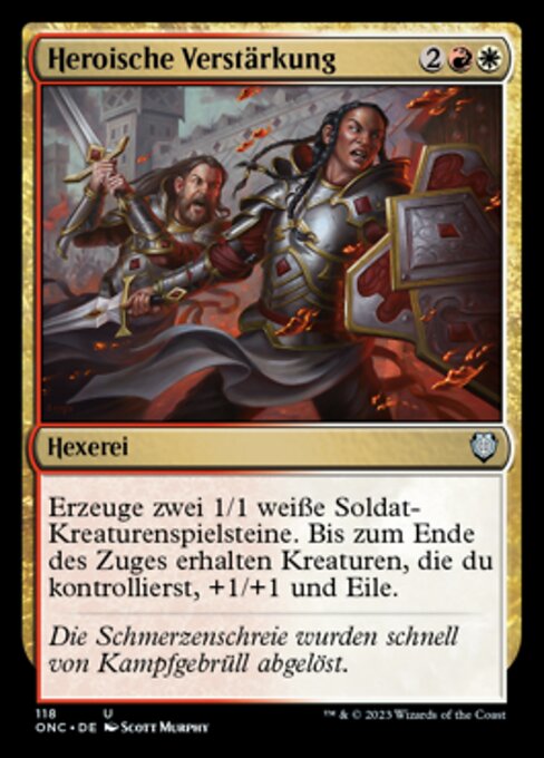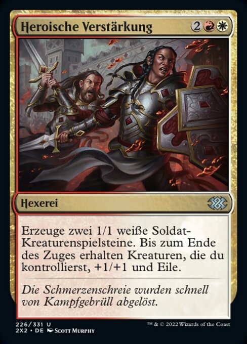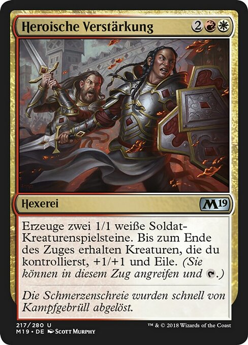 ![]() Variations— Parts— | Heroische VerstärkungErzeuge zwei 1/1 weiße Soldat-Kreaturenspielsteine. Bis zum Ende des Zuges erhalten Kreaturen, die du kontrollierst, +1/+1 und Eile.