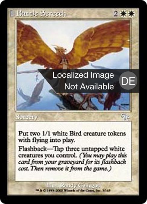 ![]() Variations— Parts— | KampfkreischenErzeuge zwei 1/1 weiße Vogel-Kreaturenspielsteine mit Flugfähigkeit. Rückblende — Tappe drei ungetappte weiße Kreaturen, die du kontrollierst. (Du kannst diese Karte aus deinem Friedhof für ihre Rückblendekosten wirken. Schicke sie danach ins Exil.)