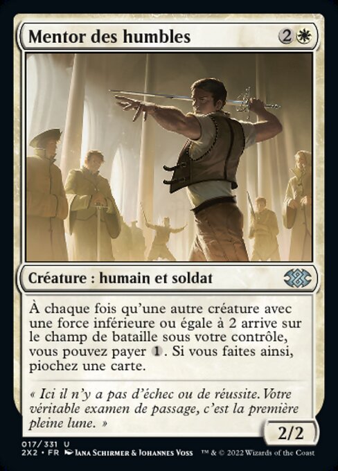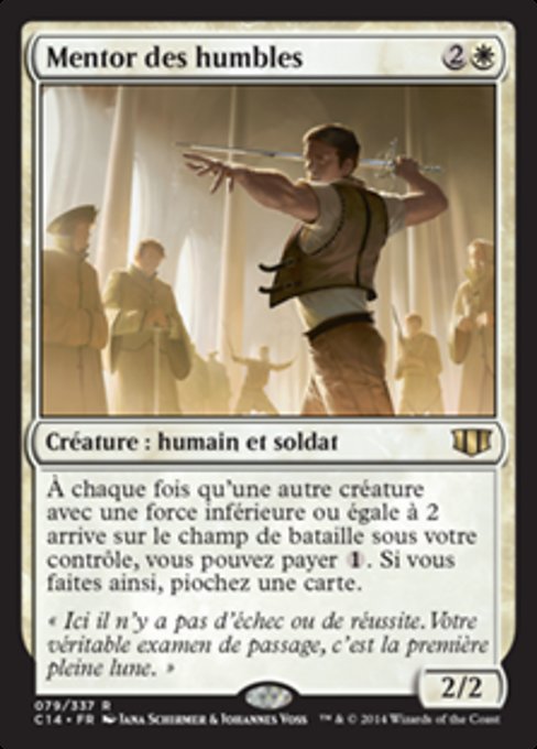 |  Variations— Parts— | Mentor des humbles2 / 2 À chaque fois qu'une autre créature avec une force inférieure ou égale à 2 arrive sur le champ de bataille sous votre contrôle, vous pouvez payer