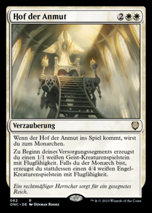 |  Variations— Parts— | Corte della GraziaQuando la Corte della Grazia entra nel campo di battaglia, diventi il monarca. All'inizio del tuo mantenimento, crea una pedina creatura Spirito 1/1 bianca con volare. Se sei il monarca, crea invece una pedina creatura Angelo 4/4 bianca con volare.