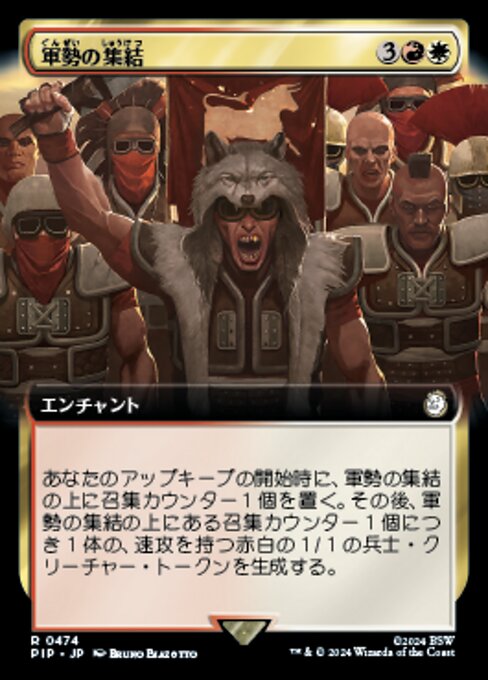 ![]() Variations— Parts— | 軍勢の集結あなたのアップキープの開始時に、軍勢の集結の上に召集カウンター1個を置く。その後、軍勢の集結の上にある召集カウンター1個につき1体の、速攻を持つ赤白の1/1の兵士・クリーチャー・トークンを生成する。