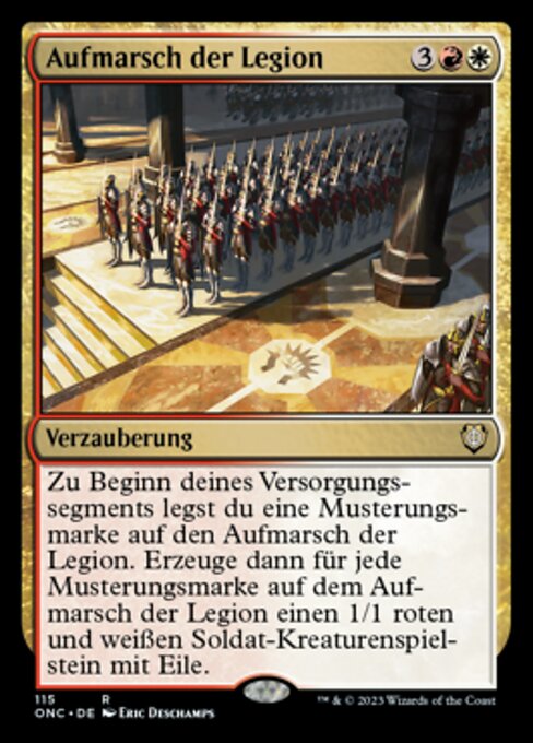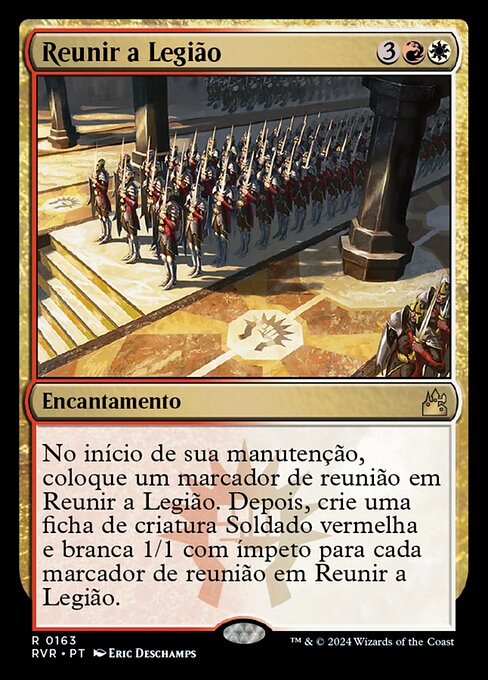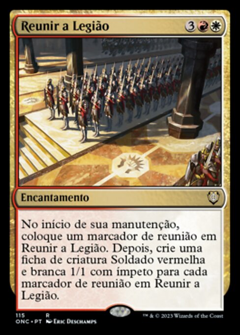 ![]() Variations— Parts— | Reunir a LegiãoNo início de sua manutenção, coloque um marcador de reunião em Reunir a Legião. Depois, crie uma ficha de criatura Soldado vermelha e branca 1/1 com ímpeto para cada marcador de reunião em Reunir a Legião.
