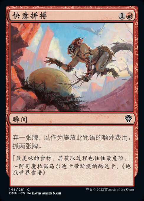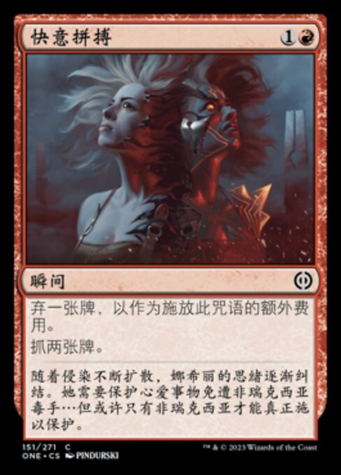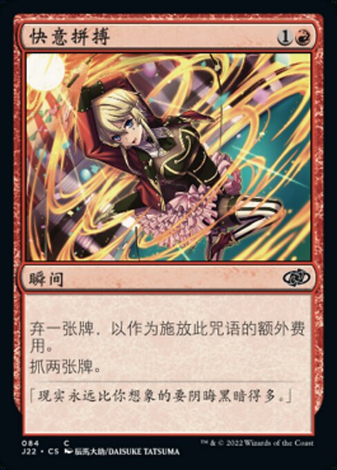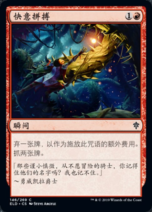 |  Variations— Parts— | 快意拼搏弃一张牌,以作为施放此咒语的额外费用。 抓两张牌。
