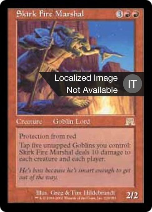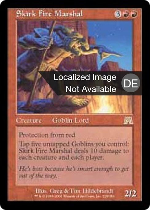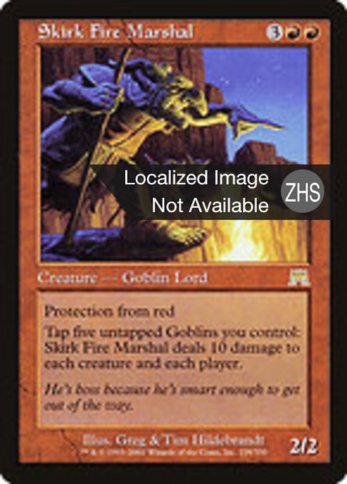 |  Variations— Parts— | Skirk Fire Marshal2 / 2 Protection from red Tap five untapped Goblins you control: This creature deals 10 damage to each creature and each player.