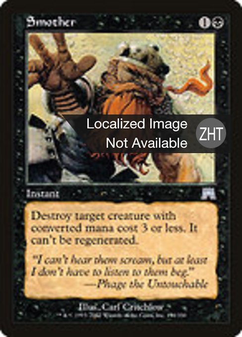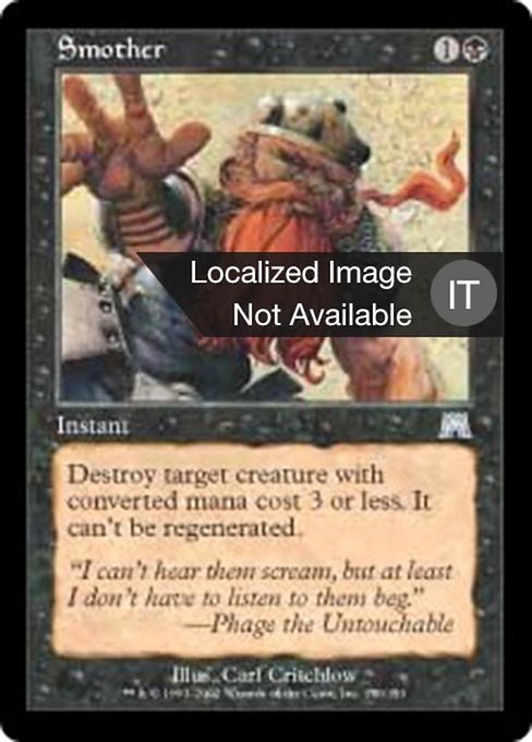 ![]() Variations— Parts— | StrangolareDistruggi una creatura bersaglio con costo di mana convertito pari o inferiore a 3. Non può essere rigenerata.
