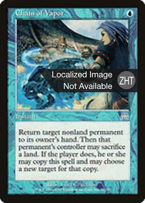 |  Variations— Parts— | Catena di VaporeIl proprietario riprende in mano un permanente non terra bersaglio. Poi il controllore di quel permanente può sacrificare una terra. Se lo fa, può copiare questa magia e può scegliere un nuovo bersaglio per quella copia.