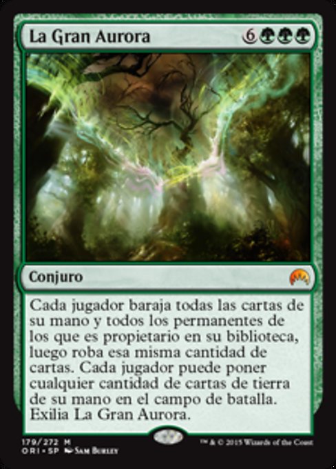 |  Variations— Parts— | The Great AuroraEach player shuffles all cards from their hand and all permanents they own into their library, then draws that many cards. Each player may put any number of land cards from their hand onto the battlefield. Exile The Great Aurora.