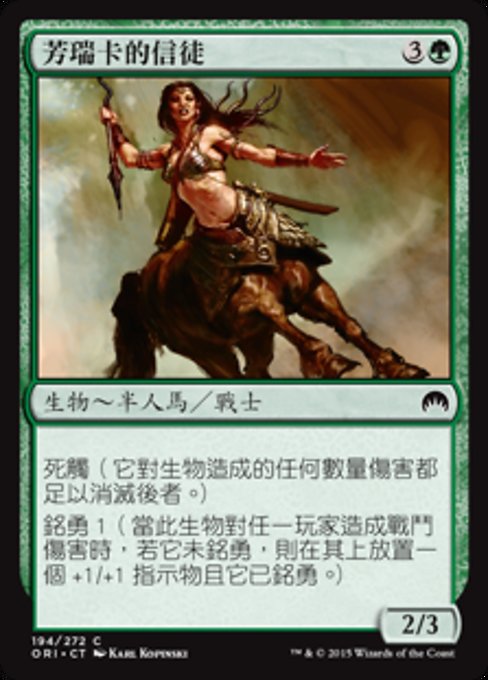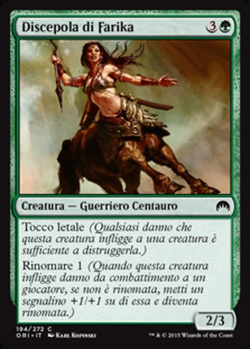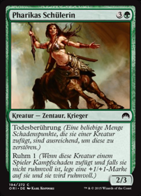 |  Variations— Parts— | Pharika's Disciple2 / 3 Deathtouch (Any amount of damage this deals to a creature is enough to destroy it.) Renown 1 (When this creature deals combat damage to a player, if it isn't renowned, put a +1/+1 counter on it and it becomes renowned.)