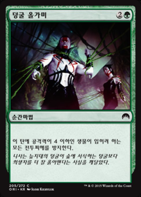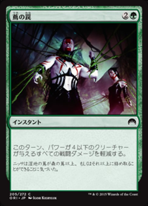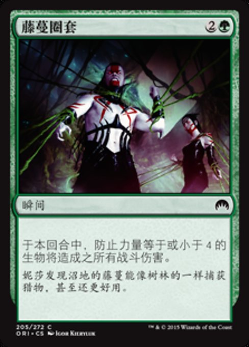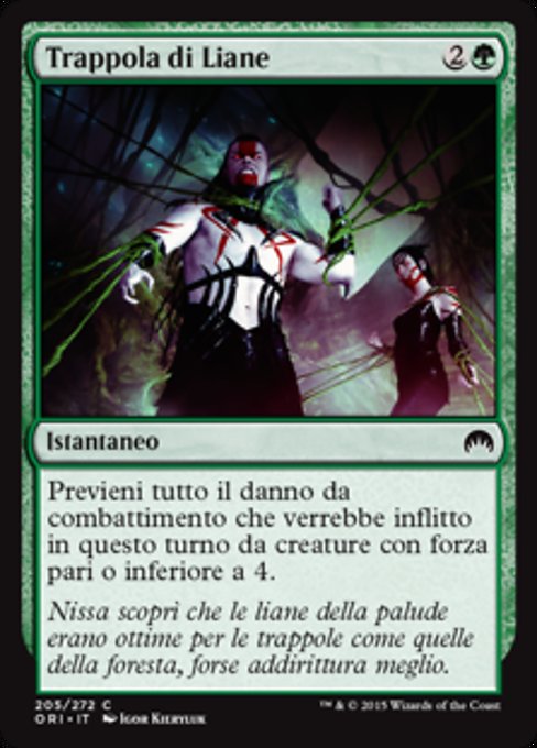 ![]() Variations— Parts— | Vine SnarePrevent all combat damage that would be dealt this turn by creatures with power 4 or less.