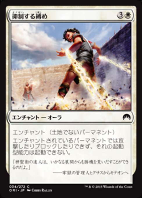 |  Variations— Parts— | Suppression BondsEnchant nonland permanent Enchanted permanent can't attack or block, and its activated abilities can't be activated.