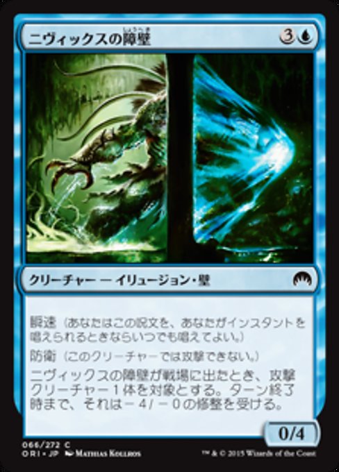 |  Variations— Parts— | Nivix Barrier0 / 4 Flash (You may cast this spell any time you could cast an instant.) Defender (This creature can't attack.) When this creature enters, target attacking creature gets -4/-0 until end of turn.