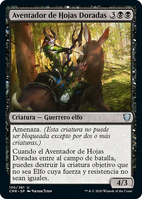 ![]() Variations— Parts— | Aventador de Hojas Doradas4 / 3 Amenaza. (Esta criatura no puede ser bloqueada excepto por dos o más criaturas.)Cuando el Aventador de Hojas Doradas entre al campo de batalla, puedes destruir la criatura objetivo que no sea Elfo cuya fuerza y resistencia no sean iguales.