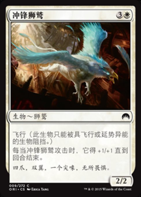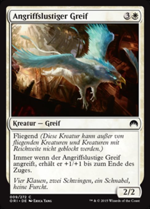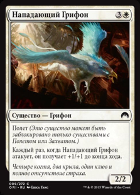 ![]() Variations— Parts— | Griffon chargeur2 / 2 Vol (Cette créature ne peut pas être bloquée excepté par des créatures avec le vol ou la portée.)À chaque fois que le Griffon chargeur attaque, il gagne +1/+1 jusqu'à la fin du tour.