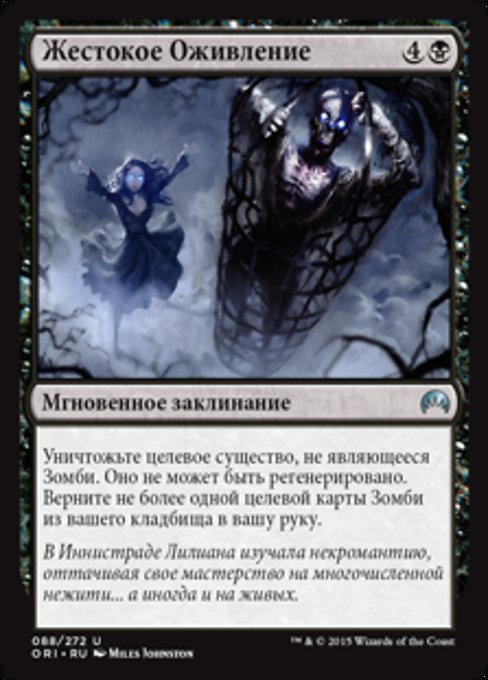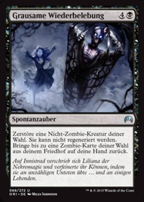 ![]() Variations— Parts— | Rinascita CrudeleDistruggi una creatura non Zombie bersaglio. Non può essere rigenerata. Riprendi in mano fino a una carta Zombie bersaglio dal tuo cimitero.