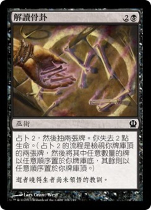 |  Variations— Parts— | 解讀骨卦占卜2,然後抽兩張牌。你失去2點生命。(占卜2的流程是檢視你牌庫頂的兩張牌,然後將其中任意數量的牌以任意順序置於你牌庫底,其餘則以任意順序置於你牌庫頂。)