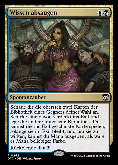 ![]() Variations— Parts— | Siphon InsightLook at the top two cards of target opponent's library. Exile one of them face down and put the other on the bottom of that library. You may play the exiled card for as long as it remains exiled, and you may spend mana as though it were mana of any color to cast that spell. Flashback