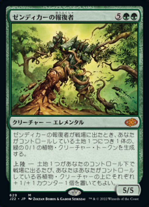 |  Variations— Parts— | ゼンディカーの報復者5 / 5 ゼンディカーの報復者が戦場に出たとき、あなたがコントロールしている土地1つにつき1体の、緑の0/1の植物・クリーチャー・トークンを生成する。 上陸 ― 土地1つがあなたのコントロール下で戦場に出るたび、あなたがコントロールしている各植物・クリーチャーの上にそれぞれ+1/+1カウンター1個を置いてもよい。