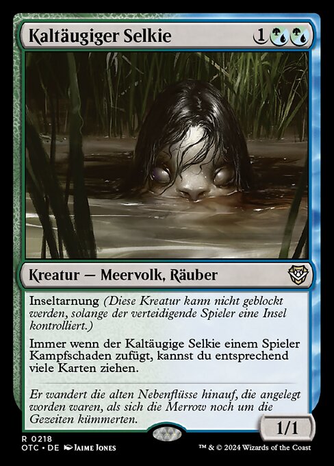 ![]() Variations— Parts— | 冷淡なセルキー1 / 1 島渡り(防御プレイヤーが島をコントロールしているかぎり、このクリーチャーはブロックされない。) 冷淡なセルキーがプレイヤー1人に戦闘ダメージを与えるたび、あなたはその点数に等しい枚数のカードを引いてもよい。