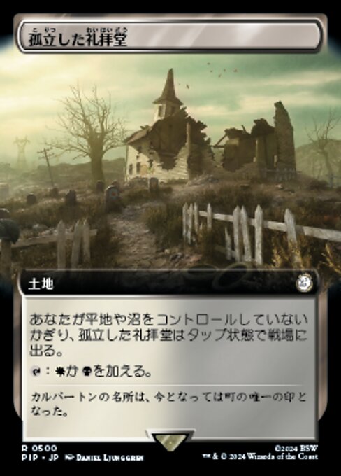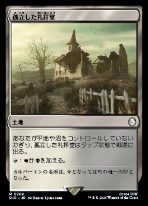 |  Variations— Parts— | 孤立した礼拝堂あなたが平地や沼をコントロールしていないかぎり、孤立した礼拝堂はタップ状態で戦場に出る。