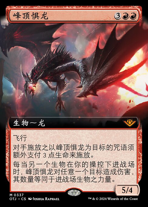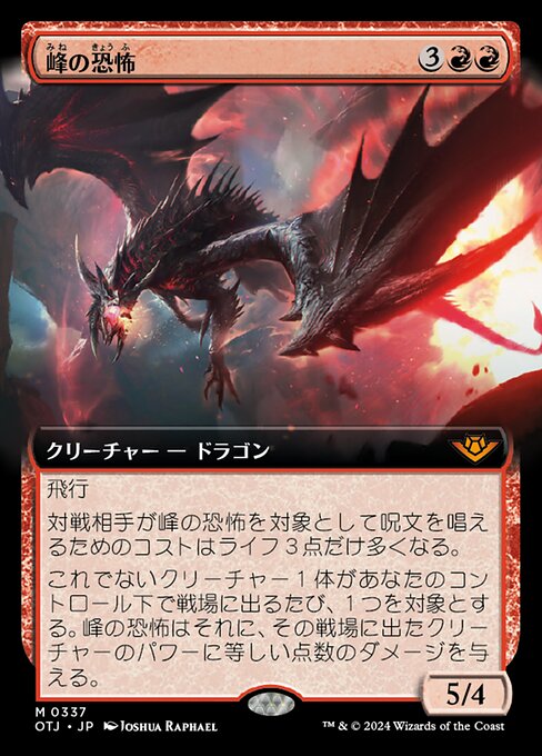 ![]() Variations : 1Parts— | Terror of the Peaks5 / 4 Flying Spells your opponents cast that target this creature cost an additional 3 life to cast. Whenever another creature you control enters, this creature deals damage equal to that creature's power to any target.
